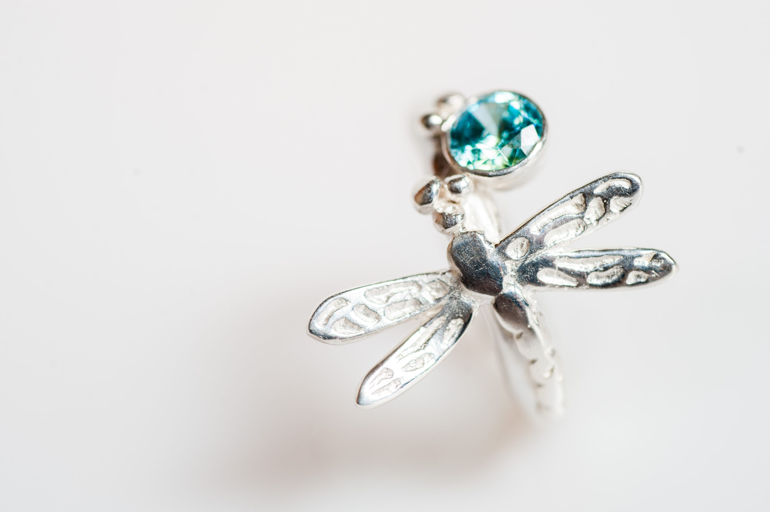 This wonderful dragonfly ring adds a little sparkle to your life. Fluttering around made from 925 Sterling silver. With its light blue, cubic zirconia coloured stone this ring will always attract attention whenever you wear it. This Hand-made ring has been hand finished and then oxidised in areas to give definition to the unique design.