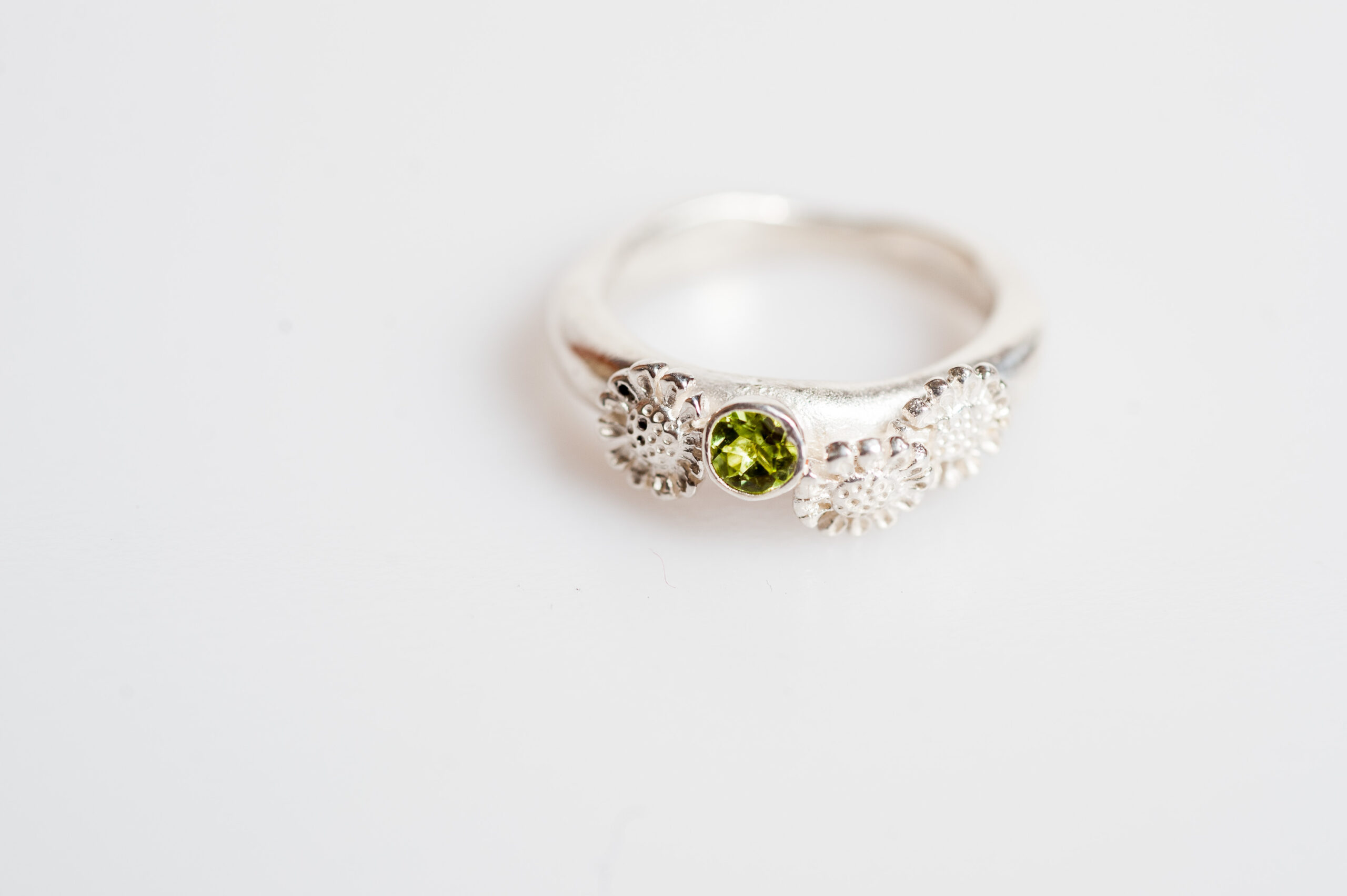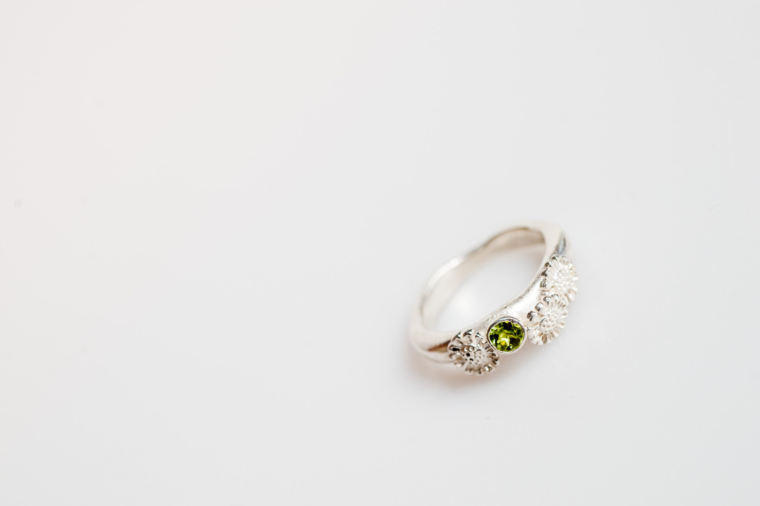 This ring has a Peridot stone set in. Peridot is the birth stone of August and is said to be associated with love and trust.